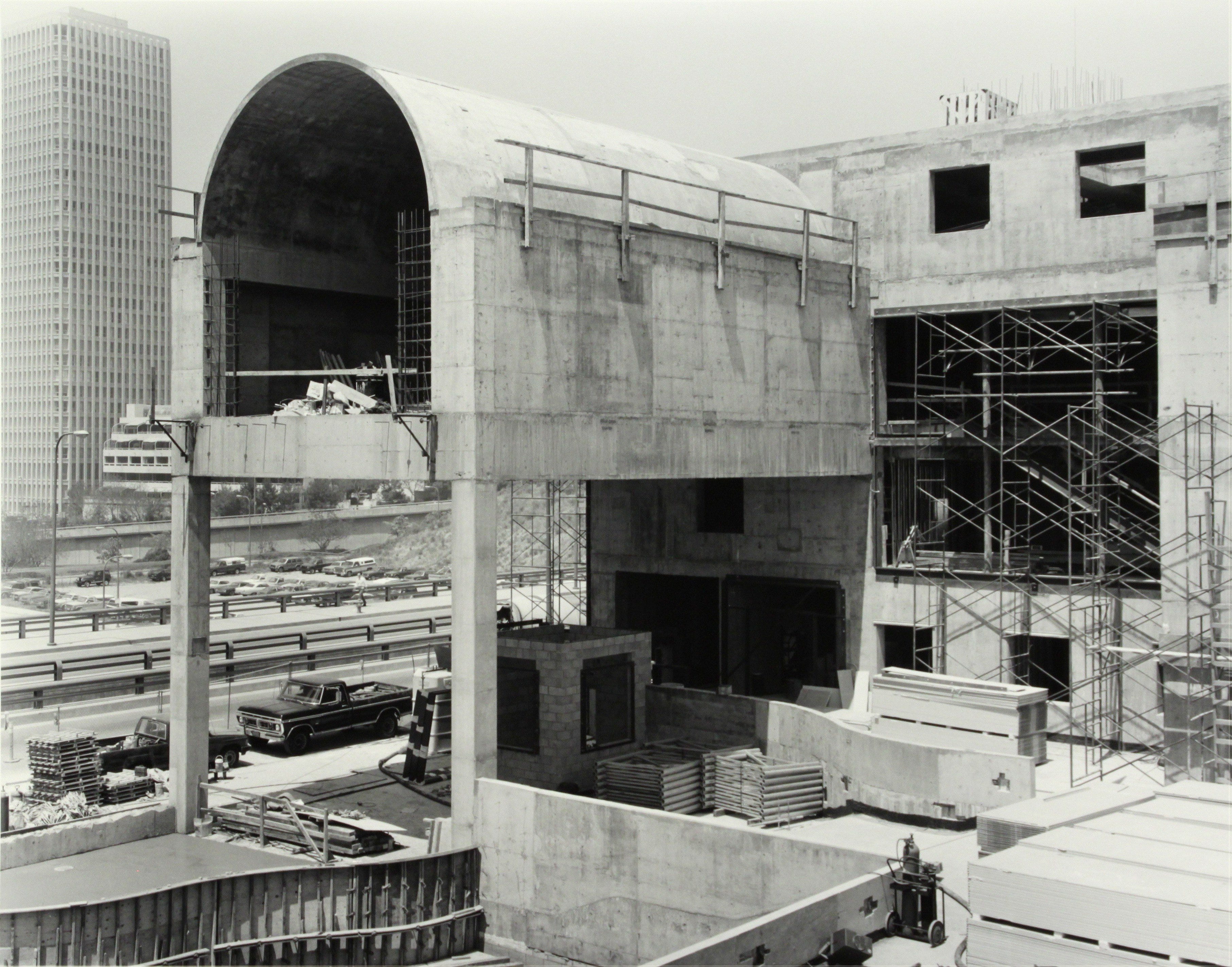 While MOCA was underway, Isozaki also designed a house on Speedway Avenue in Venice Beach and a little-known art gallery in West Hollywood near the Pacific Design Center for music industry executive and gallerist Earl McGrath. The house is still there and has been well maintained. The gallery was recently converted beyond recognition into a hair-salon. I have struggled to find photographs or drawings of the gallery. But, I did find these compelling images of MOCA under construction by New Topographics photographer Joe Deal and a very romantic image of the home at dusk. The similarity between the yet-to-be red Indian sandstone and dark green enamel-clad concrete barrel vault at MOCA and the spring/autumn pavilion in Joshua Tree is quite striking. The neat inversion of MOCA’s translucent light delivering pyramid into the house’s chamfered roof corners/light monitors is another fascinating parallel conversation between Isozaki’s three remaining Californian projects.